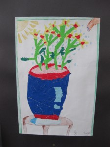 When they were finished, they added a detail to the face of the pot such as a heart, sun etc and with colored pencils lightly drew a background and table for their potted plant. Make sure it is lightly drawn so the pot remains the focus.