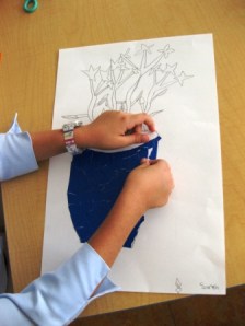 Once they were happy with their outline which had to include the pot, the pot’s rim and the plants and flowers they were ready to color in with the tape. Everyone chose a color for their pot and stuck and overlapped pieces of tape to cover the pot area. Next they chose another color for the rim and finally other tape colors for the leaves and flowers. Make sure your students use different colored tape for the different areas such as the base of the pot, the rim, the flowers, buds, leaves, details on the leaves etc. Encourage your students to stick down the tape and to tear off pieces as well as cut them with scissors.