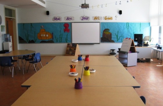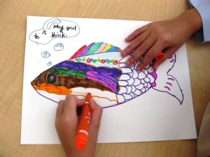 I made a large mural at the back of my classroom with an underwater theme for this school wide activity. Everyone is in the process of drawing something that belongs in the ocean– my only requirement is for them to think about and write an art goal they wish to achieve by the end of the school year on their fish, whale, mermaid, etc.