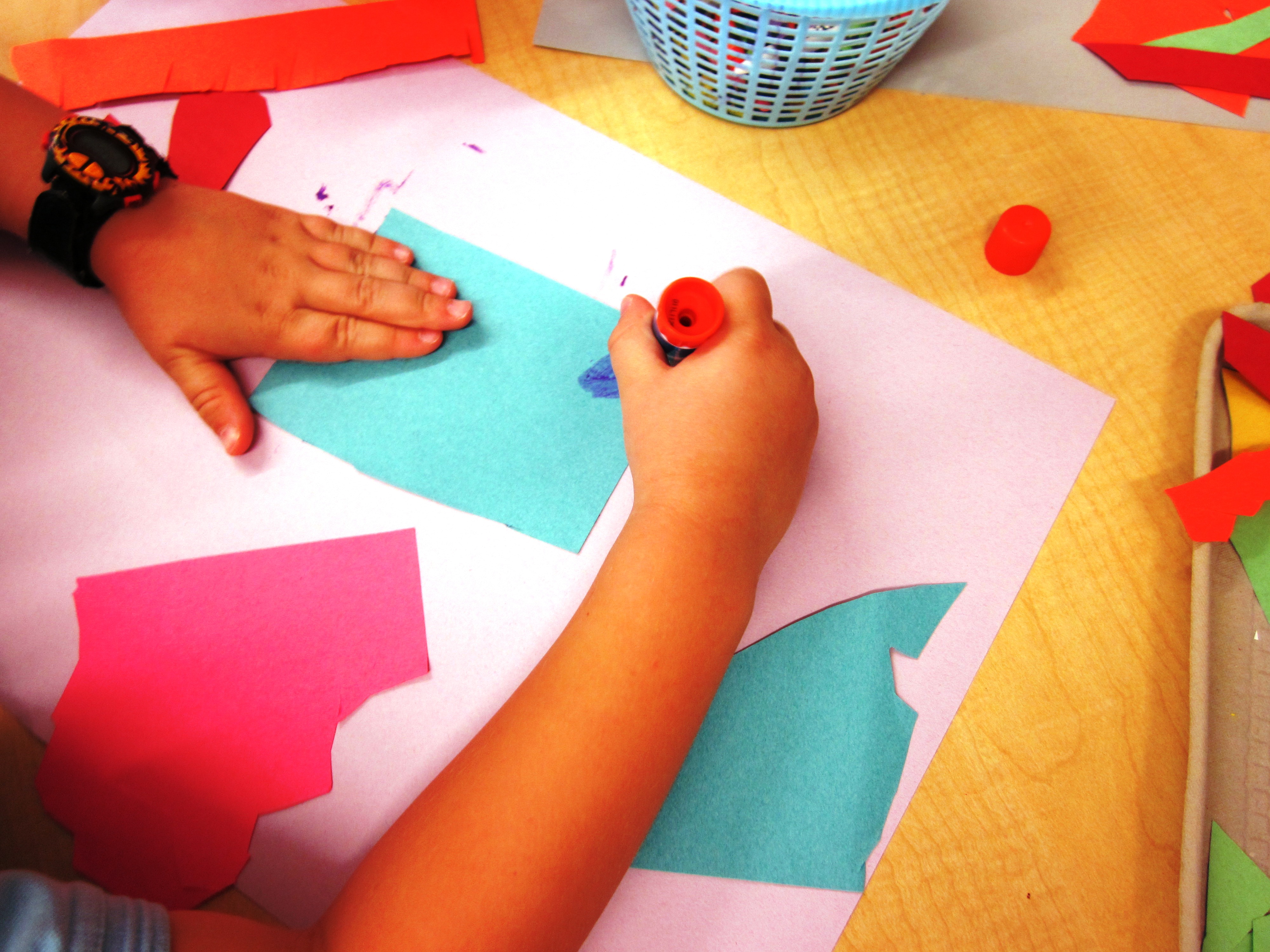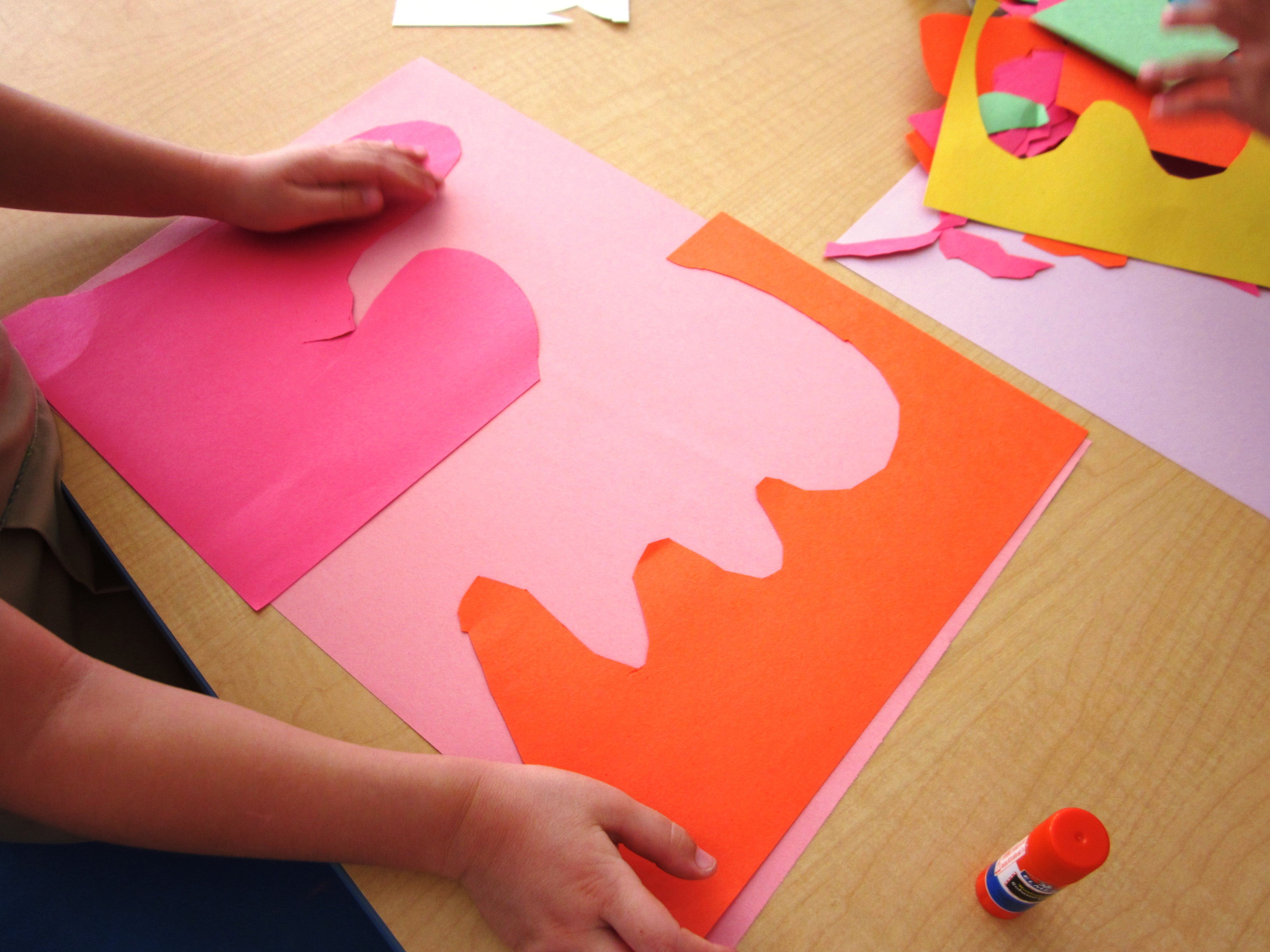 Give your students colored paper so they can cut the whole page up into organic and geometric shapes. I gave each table a tray and suggested  they work as a team. As they cut up their shapes they would place the pieces on the tray for the table to use later.