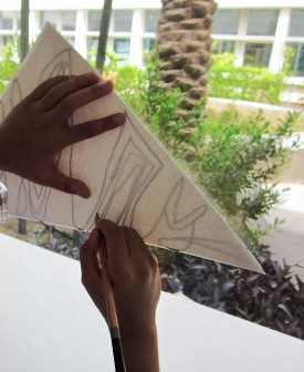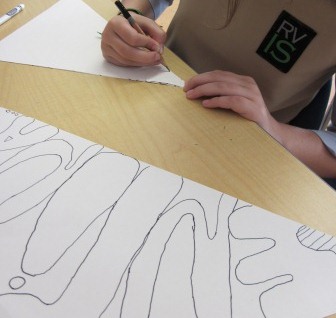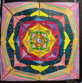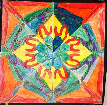 Here is a great lesson you should try with your students and it’s a project that can be done with any grade level. Your students will be creating a square radial design! Decide on the size of the paper you want and divide this paper into a triangle. Basically, just cut the paper in half diagonally. I like big projects so we used big paper.