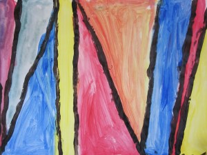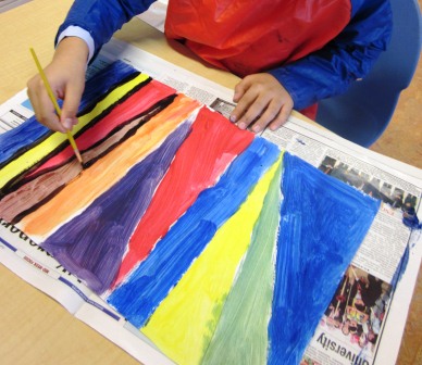 Once your students are jazzed up and ready to start, give out 12×18 paper, pencils and rulers. Ask your kids to make 10 vertical lines from top to bottom anywhere on the page. While they are doing this, take out the paint trays, styro-foam dishes or whatever you use and put out the three ‘super hero colors’ on each table. Give out brushes and make sure you also give out a water container so your students can wash their brush between colors. I use an empty yogurt container on a styro-foam tray because there will always be a spill.