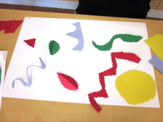 Everyone got a 12×18 piece of white construction paper. They also cut out a variety of shapes from different colored recycled paper that represented their sound. These could stick flat on the paper or pop out.