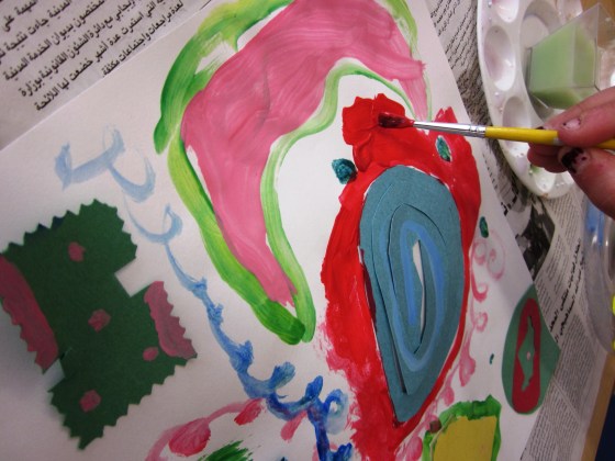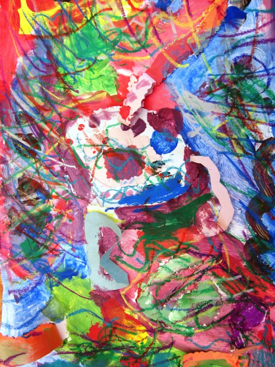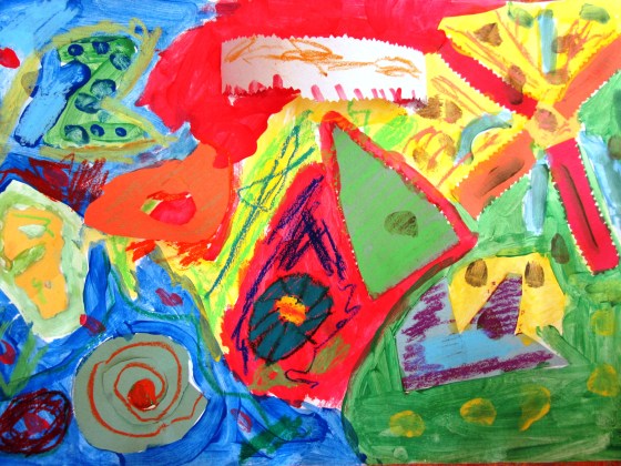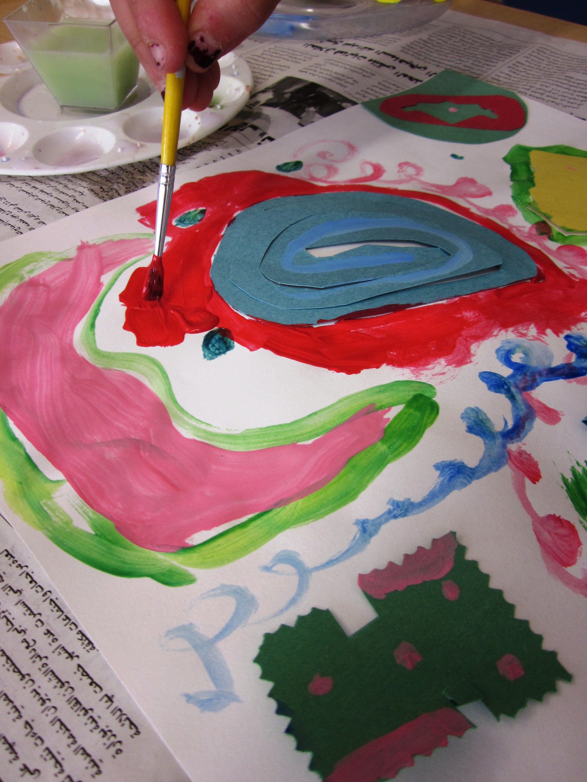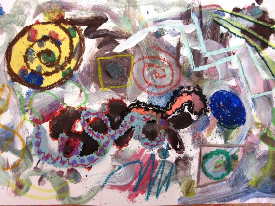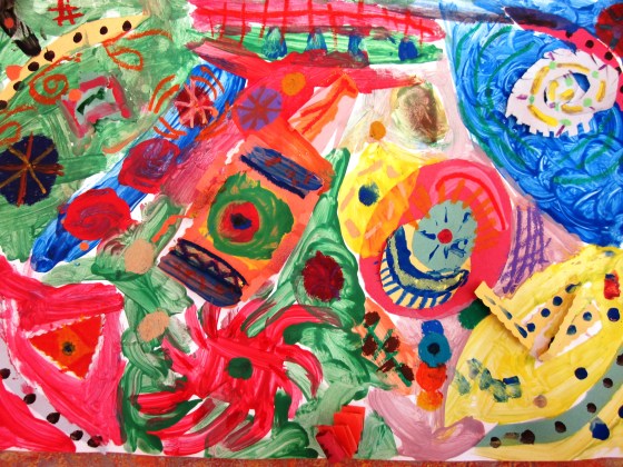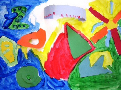 Next step was to paint more shapes and designs around and over their glued ‘sound’ shapes. I reminded them to think and hear the sound they chose in their mind while they were painting.