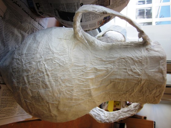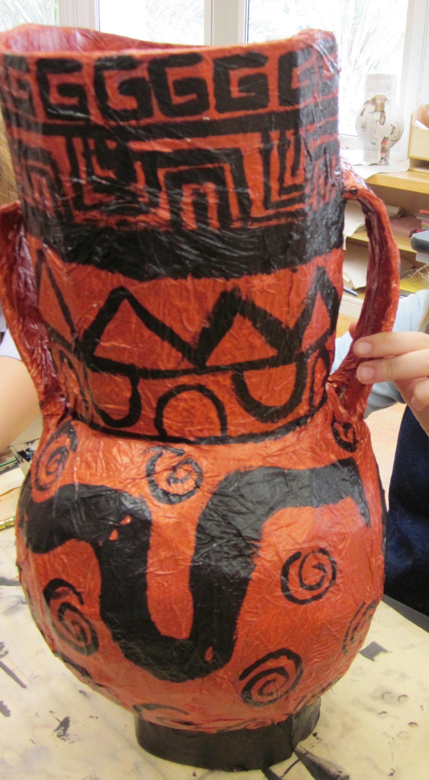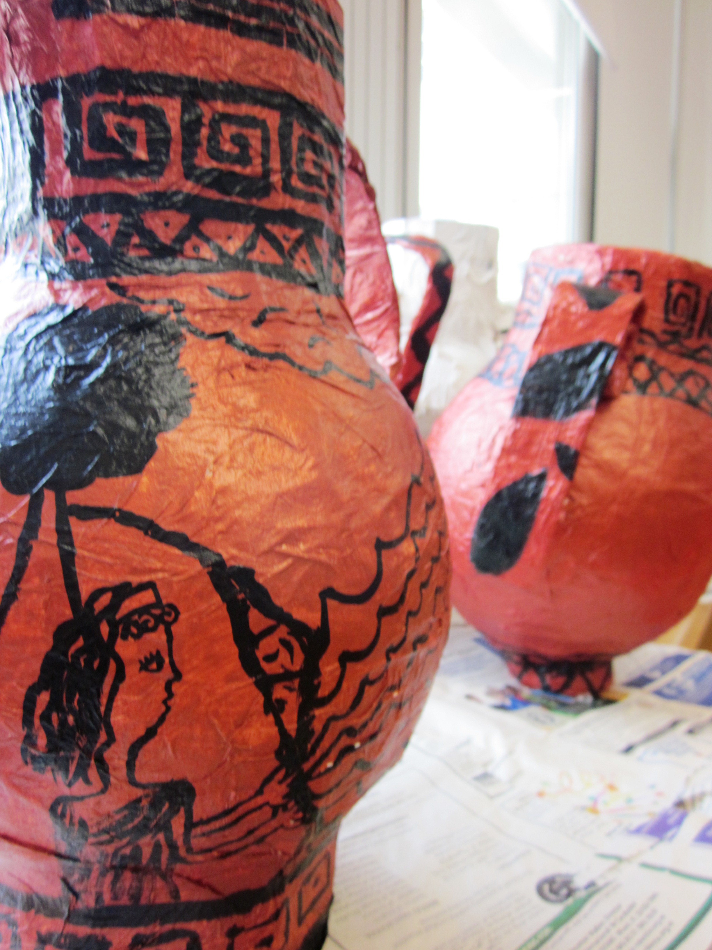 Next was the construction of the vase using a large balloon, my favorite recipe for papier mache paste, recycled cardboard pieces for the stand, neck part of the vase and handles. Once complete, we used acrylic paint for the vase, details and myth. It is important you use good quality balloons because you run the risk of them popping too soon as the strips dry. If this happens, you’re back to square one!