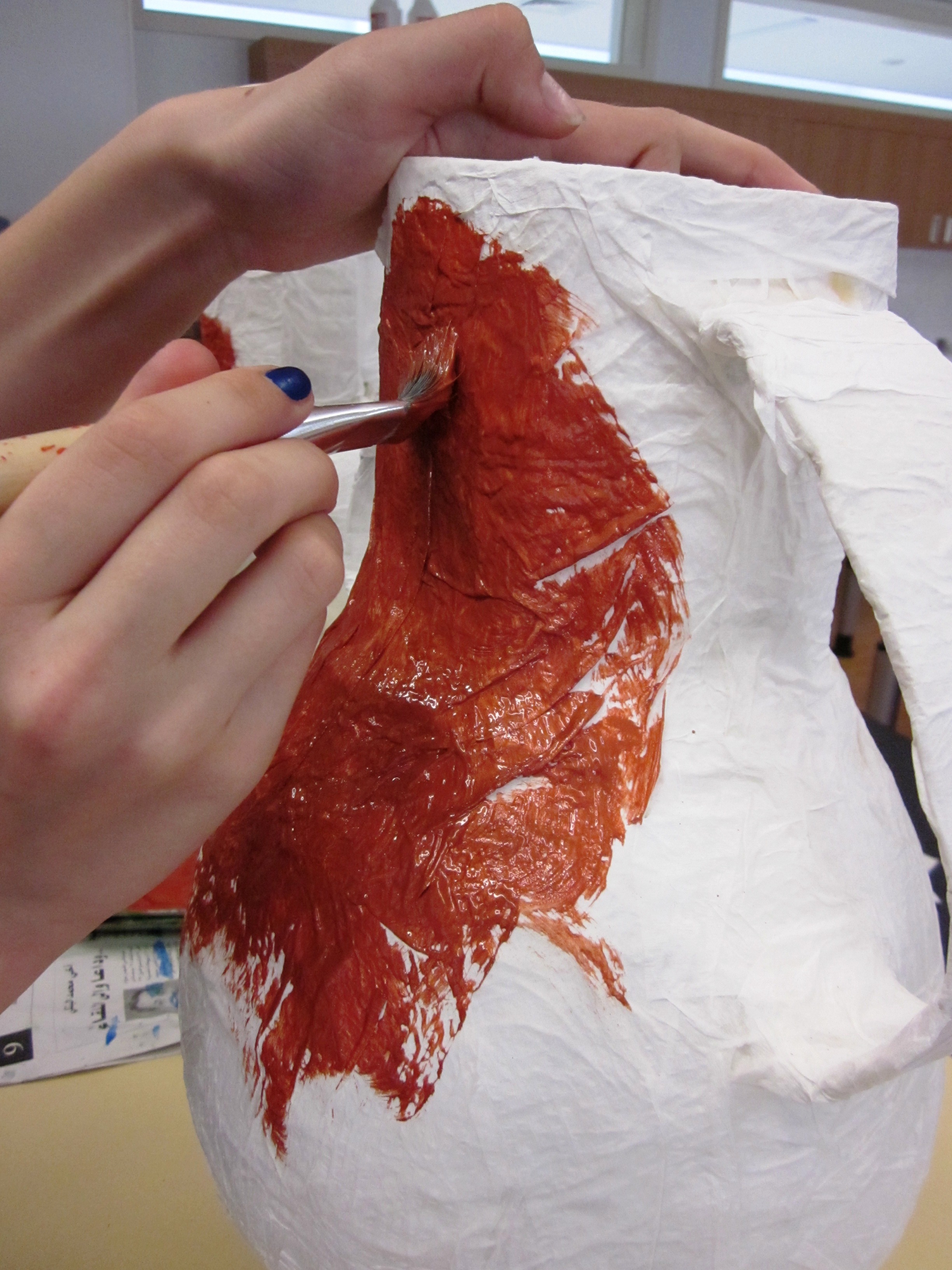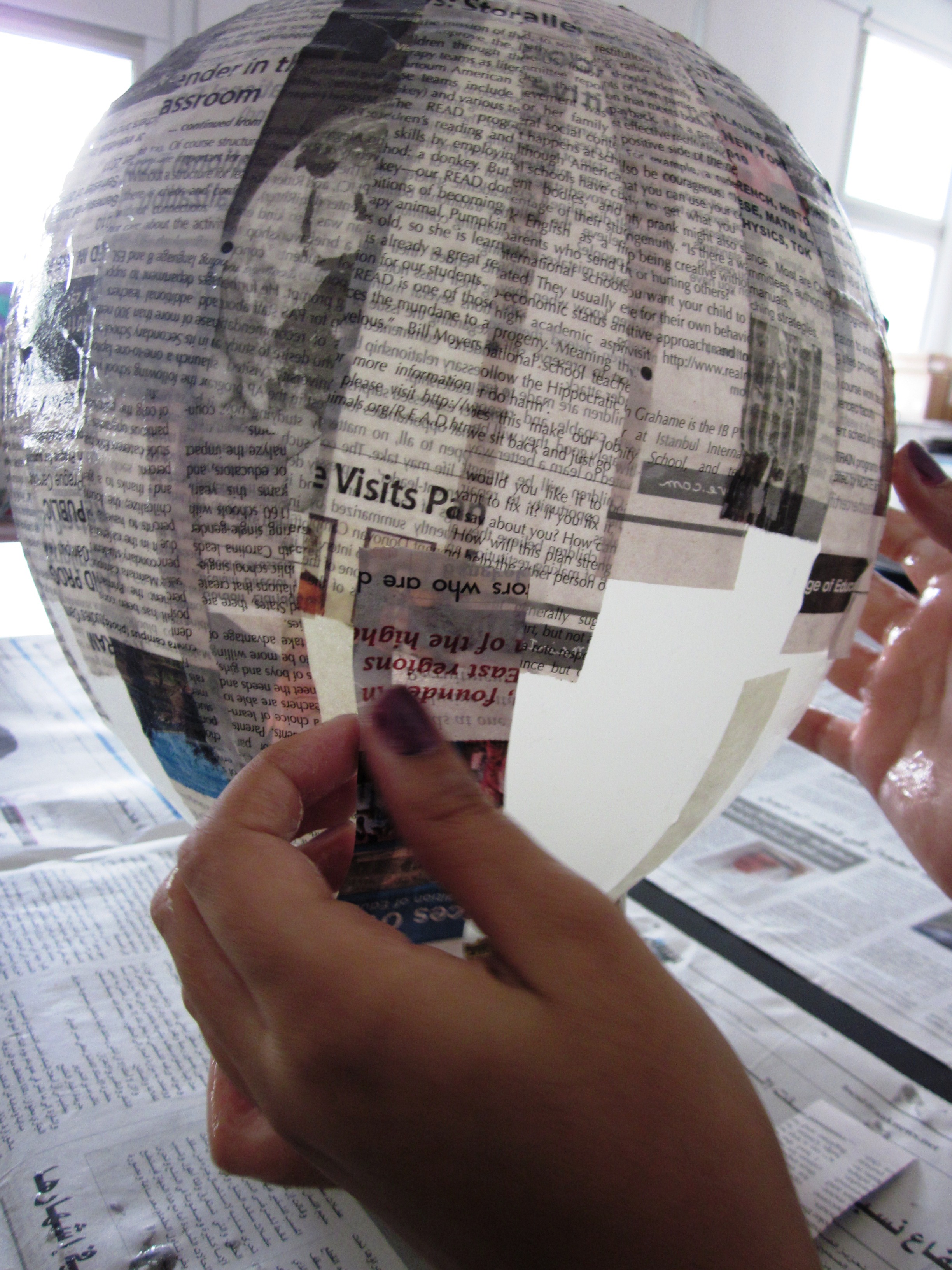 I think we used 4 layers of newspaper and then 2 layers of white paper towel paper so it would be easier to paint. Drying between layers was very quick as the papier mache paste recipe I use dries super quick. Have fun with your camp.