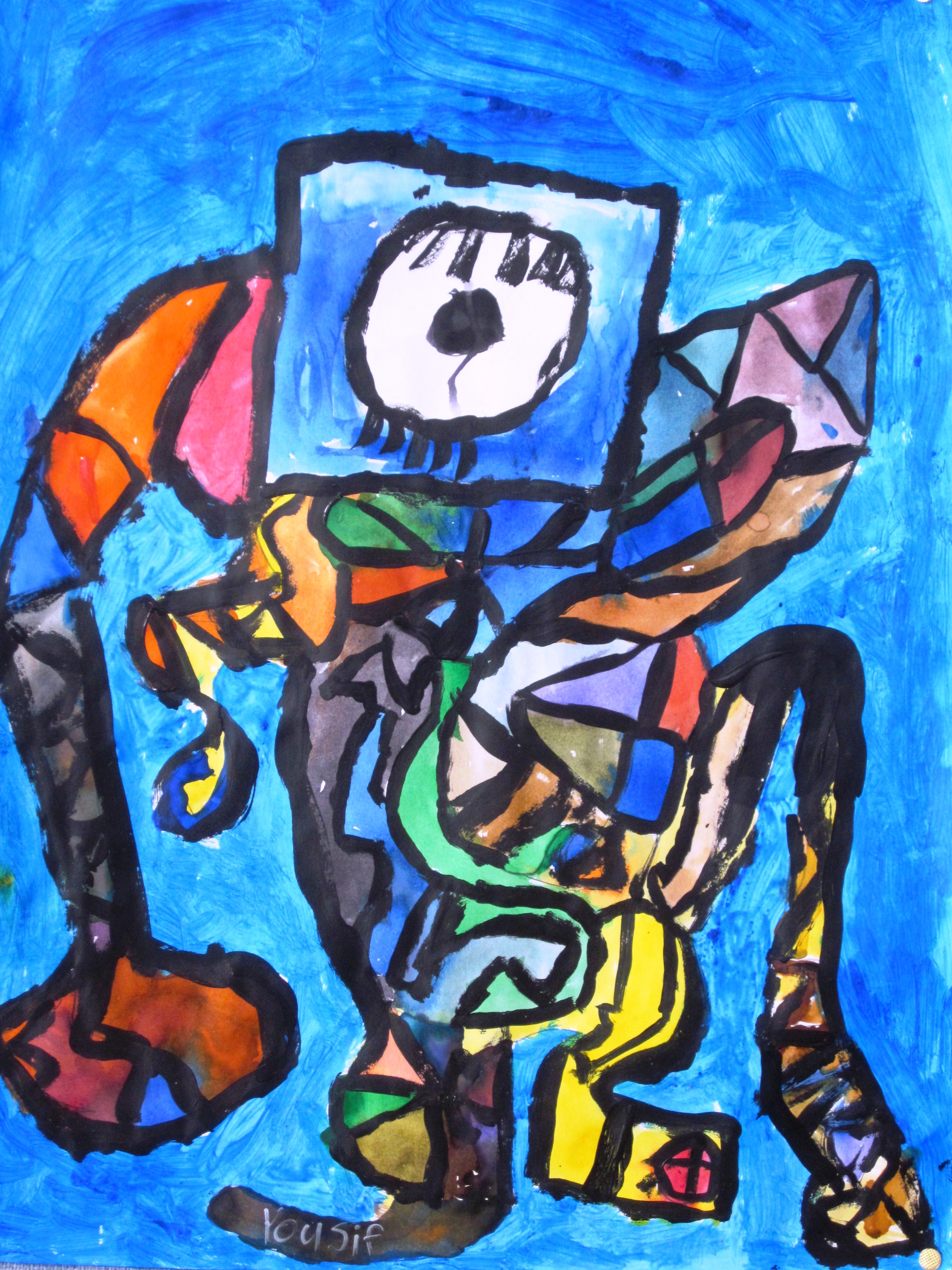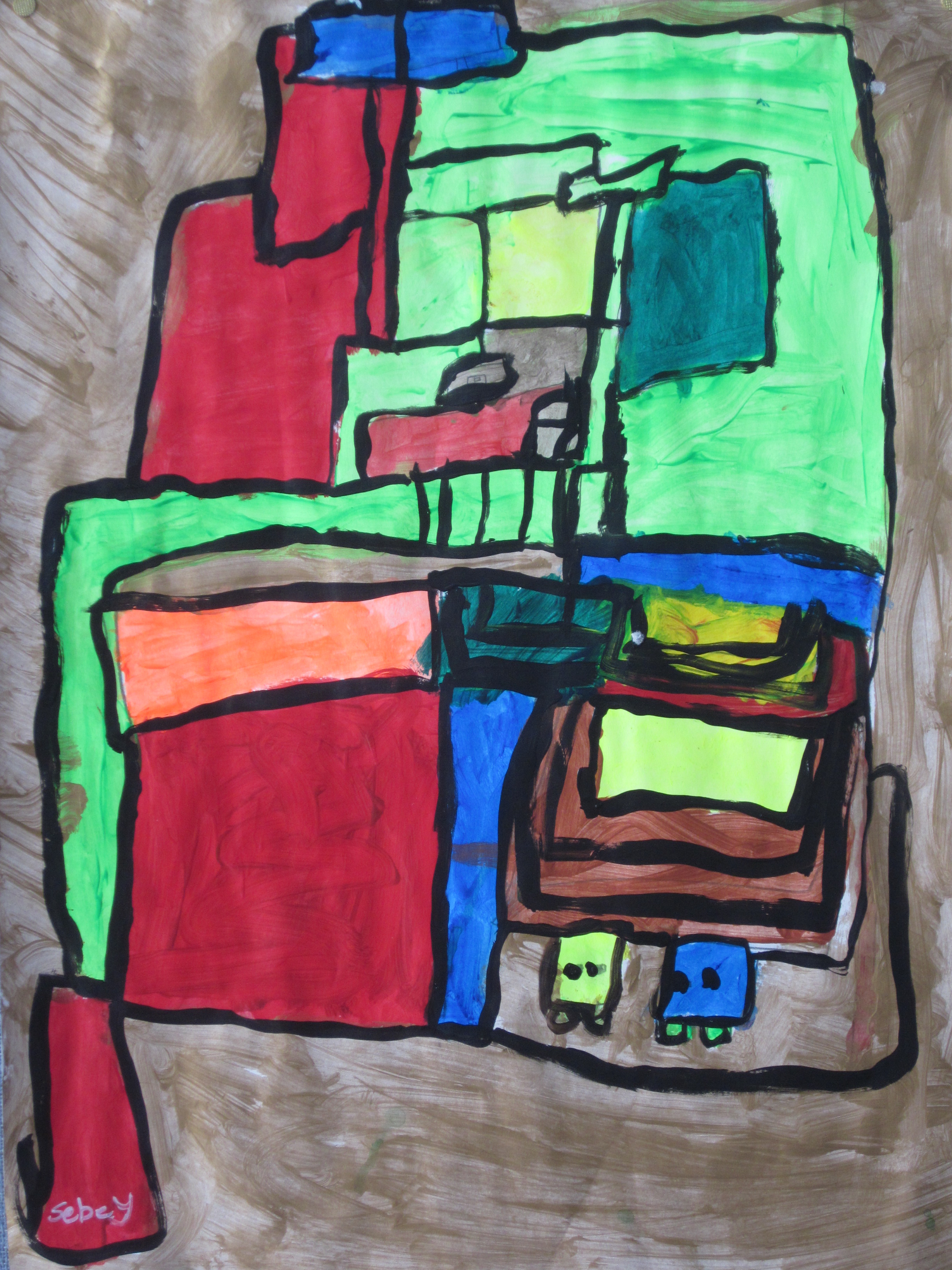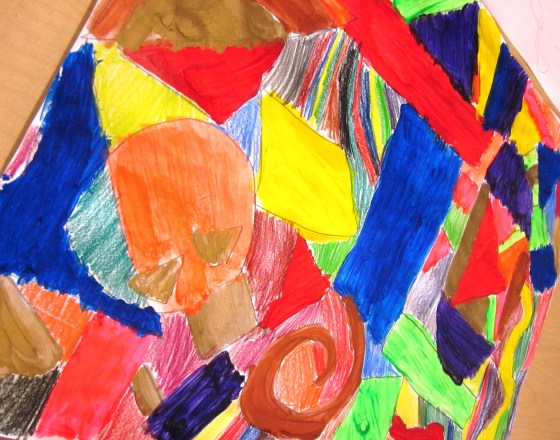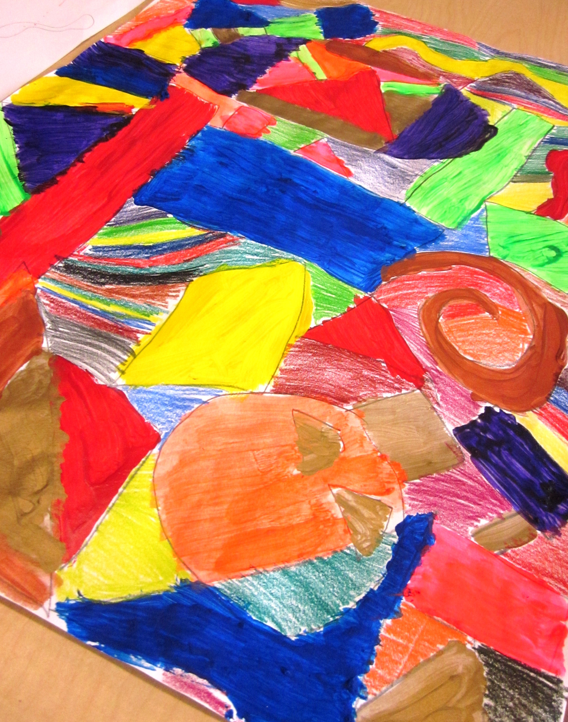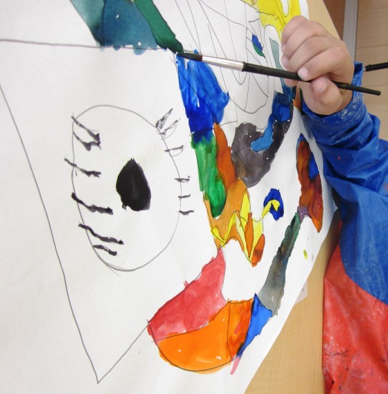 I gave out the largest paper I have and after discussing various ways of creating an abstract, let the kids start on their drawings. Each student then chose to color in the sections with either watercolors, acrylic paint or a combination of both. Since they hadn’t used acrylics yet, you can imagine which was the popular choice! Once all the areas were painted, the final part to the project was to outline each section with black acrylic paint.
