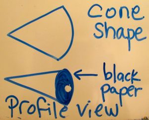 From the white scrap paper, cut out one circle and one cone shape which will be the two eyes. The round eye will be the forward looking eye and the cone shape will be the profile view of the other eye. The black paper is for the pupils.