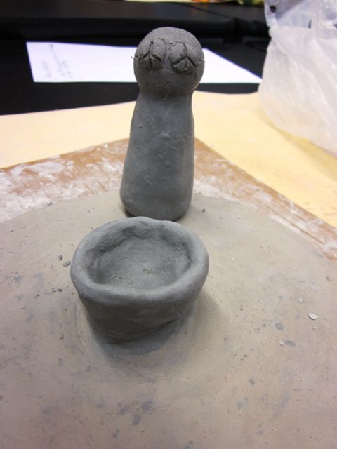 By now everyone was ready to start working with clay. After a quick reminder about how to handle clay, create a slab, scoring and using slip, the students began to create their circle slab piece for the base where their clan members would be standing. My requirements for this part of the project were the following: