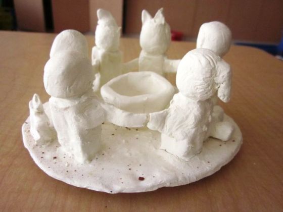 One student suggested we create a small container in the center for a candle and we all agreed it was a lovely idea. After rolling out the circle slab, they made a pinch pot container for the middle of the circle to help judge how much space was needed for the members.
