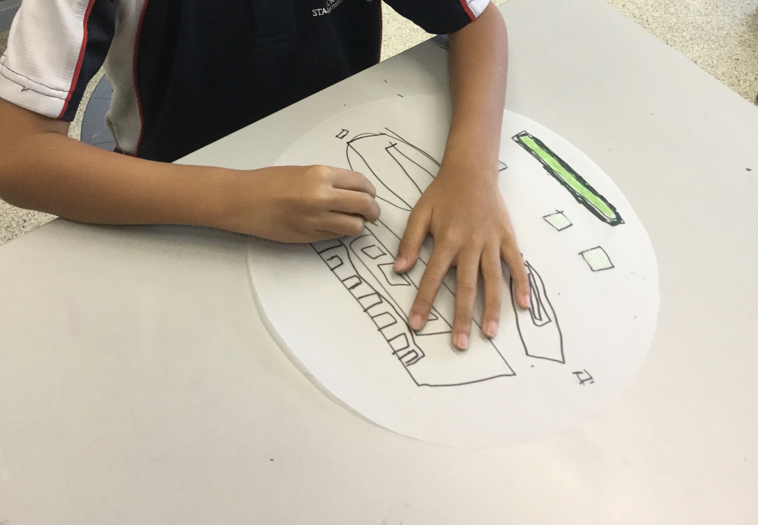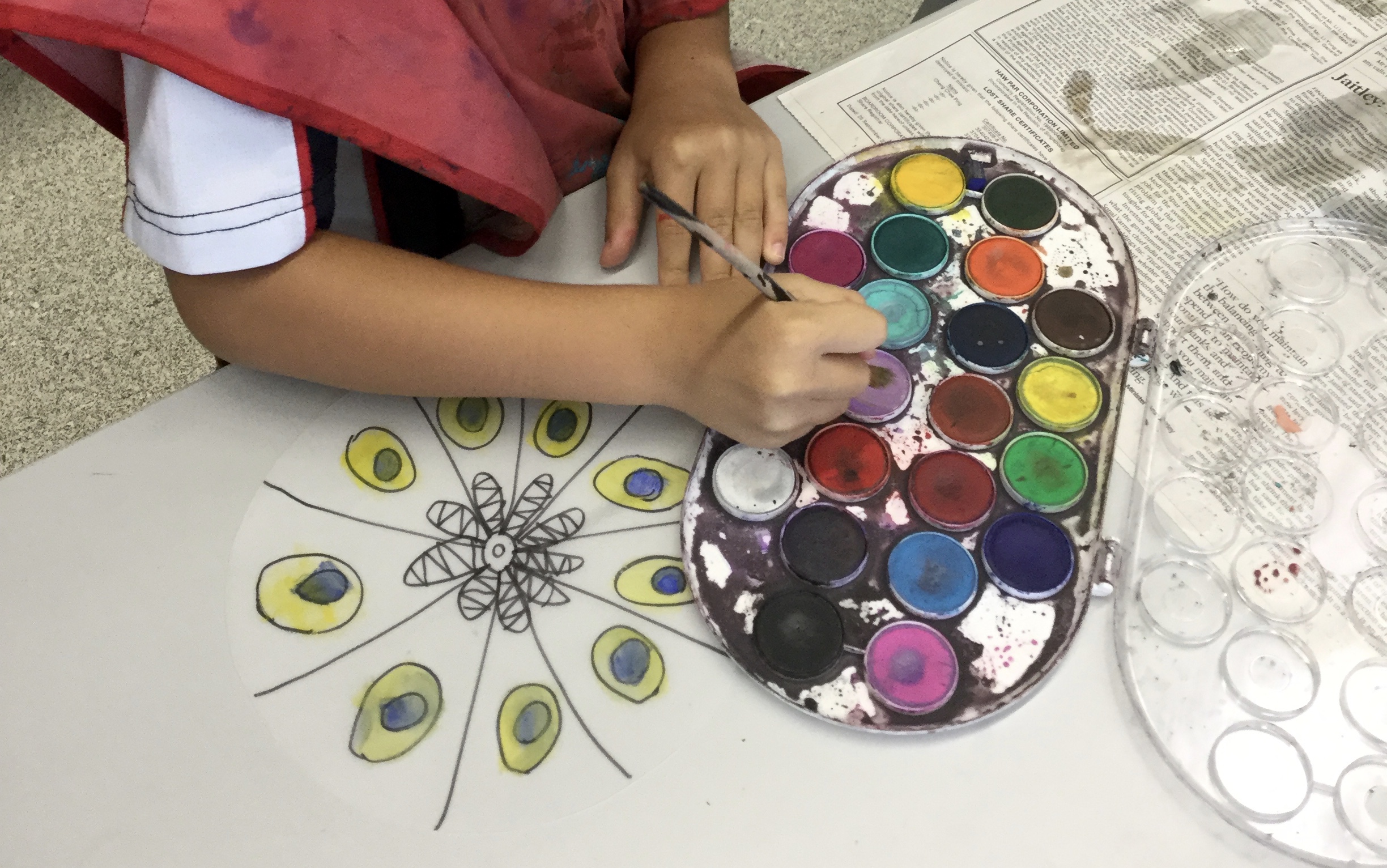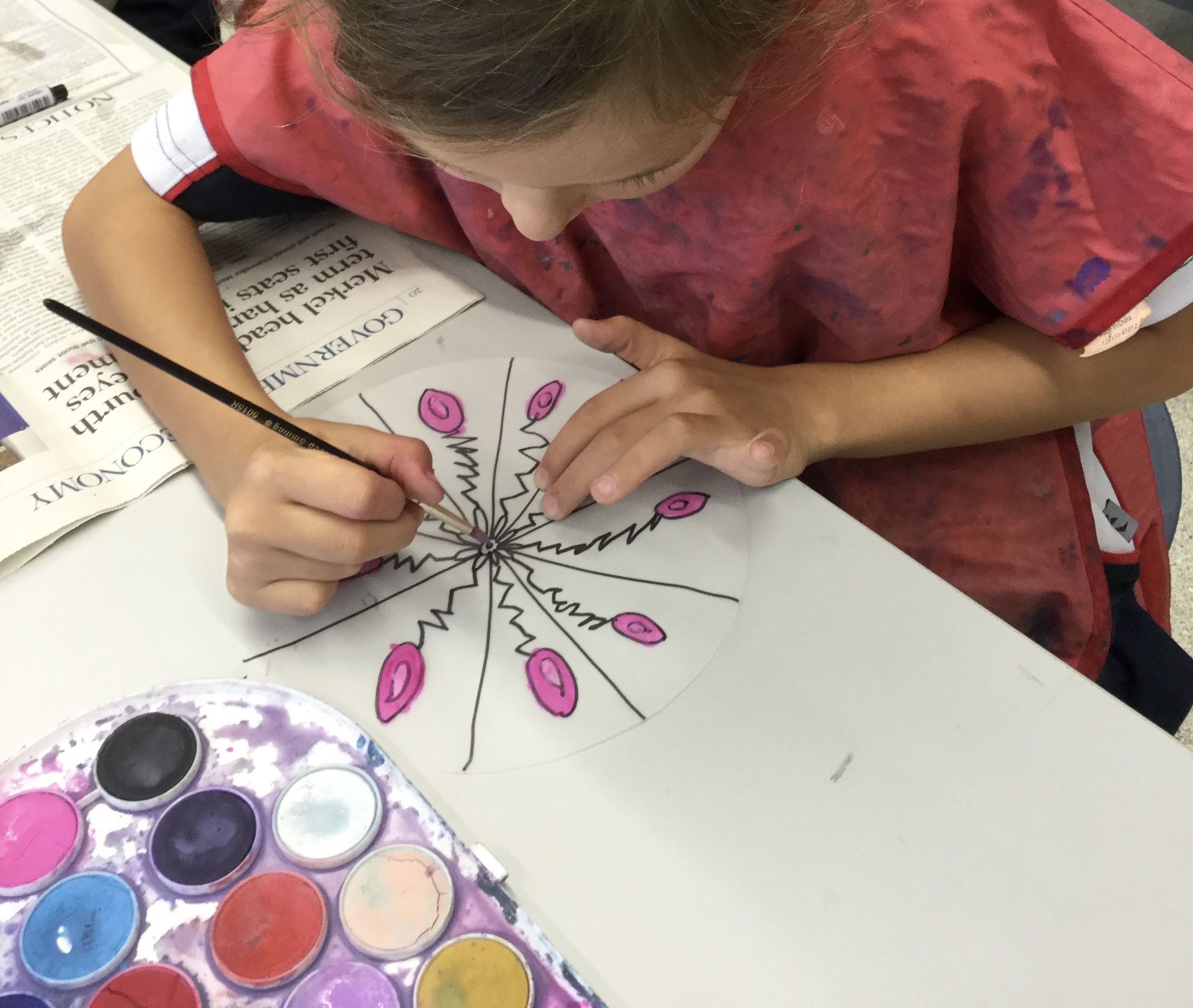 This was a lesson done with GRADE ONE. It was a collaborative piece done on round tracing paper in different sizes, and rectangles and hexagon shapes. The tables were set up into different stations with tissue paper, oil pastels, sharpie pens, markers, paint, and watercolors.