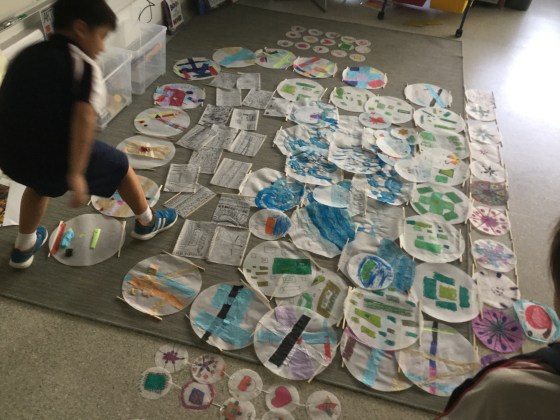 Before the stations and the doing part of this inquiry, I, of course, introduced the artist to the students. We looked at a few videos on YouTube so the students would understand what an installation is plus get a feel for Jacob, his patterns, colors, etc.