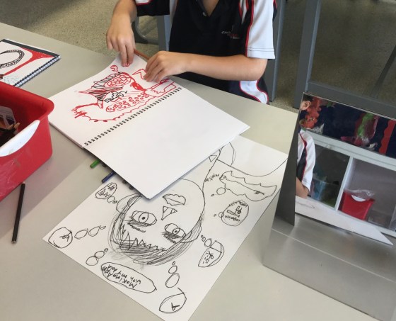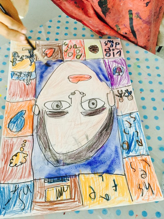 We did quite a bit of facial features practice in their sketchbooks so they could lose the fear of drawing an eye for example, and see it more as a bunch of lines that create an eye. The students went off to do their own with a mirror. The final part was to frame their portraits with clues of everything that made up their identity. Some classes mixed paint to make their skin color, others used pencils to mix skin colors.