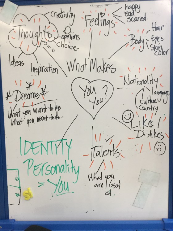 For these self-portraits, we focused on discussing what makes up our identity, personality and uniqueness. When I first asked the students what makes them different from others, the first response has to do with their physical bodies, nationalities, etc. This is all true but where I really wanted to dig deep was to understand that their thoughts, opinions, ideas, CREATIVITY, and feelings are totally theirs and totally unique.