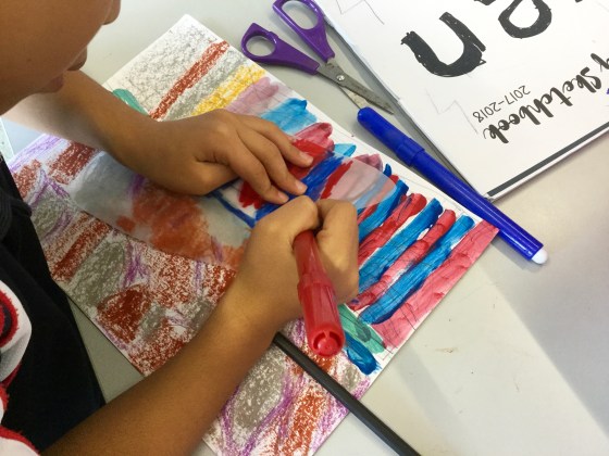 The students colored their backgrounds with 1-3 colors and then proceeded to draw their chosen animal onto drawing paper first and then tracing it on tracing paper.
