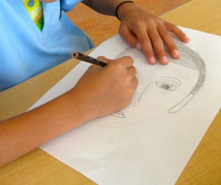 Review face proportions, have your students practice drawing their face using a stand-up mirror and do a final drawing on a piece of paper no bigger than the surface size of your box.