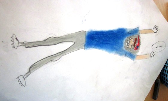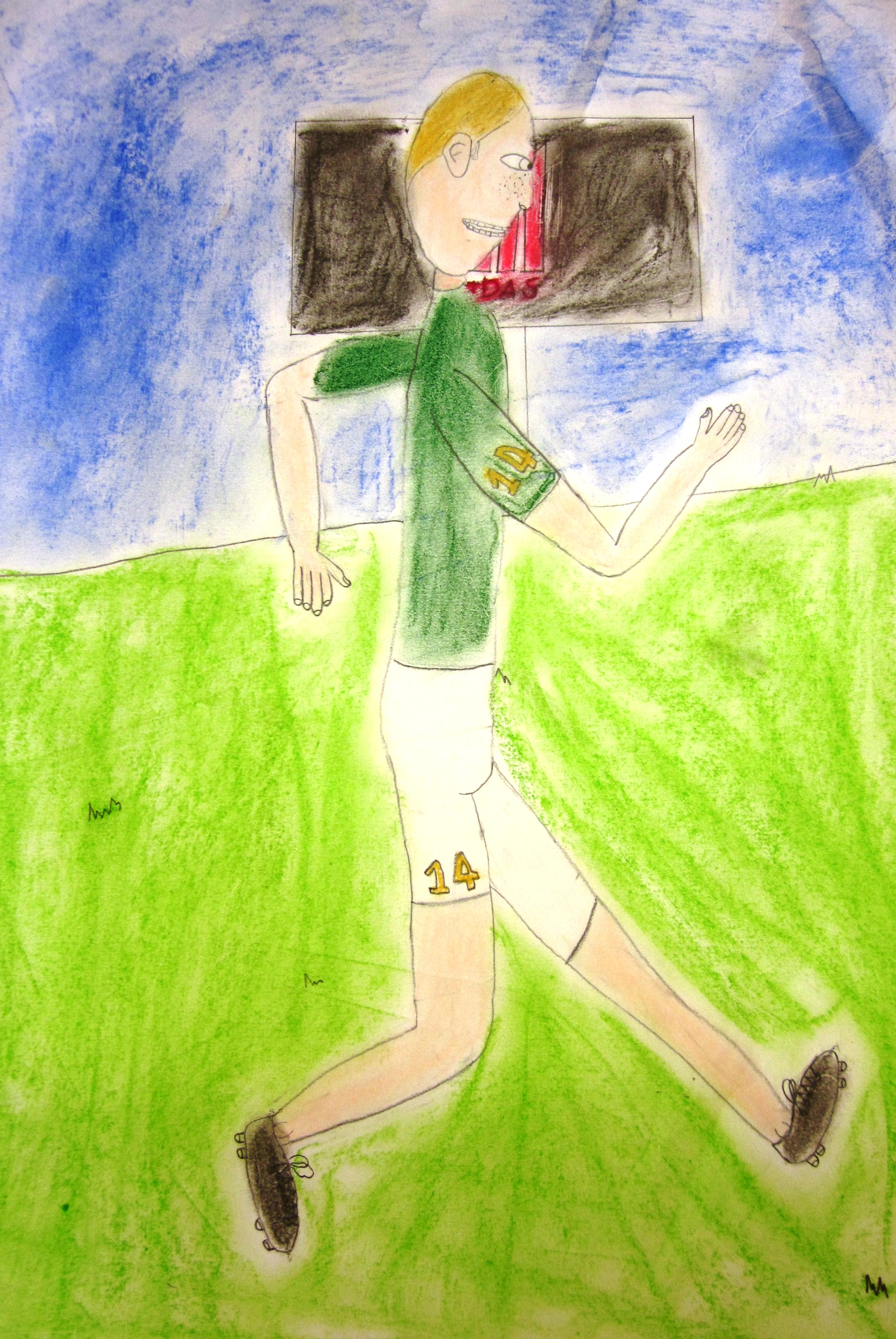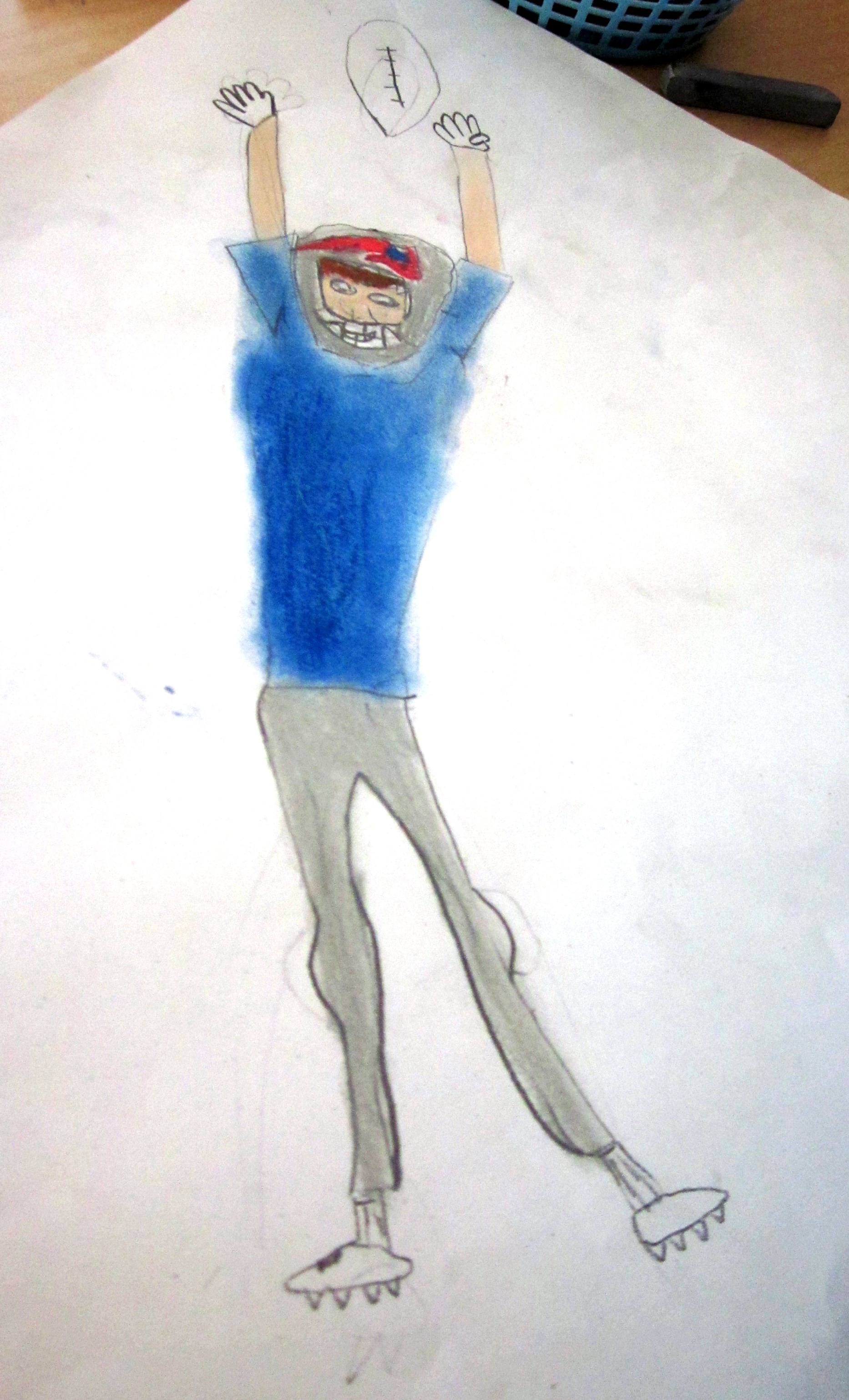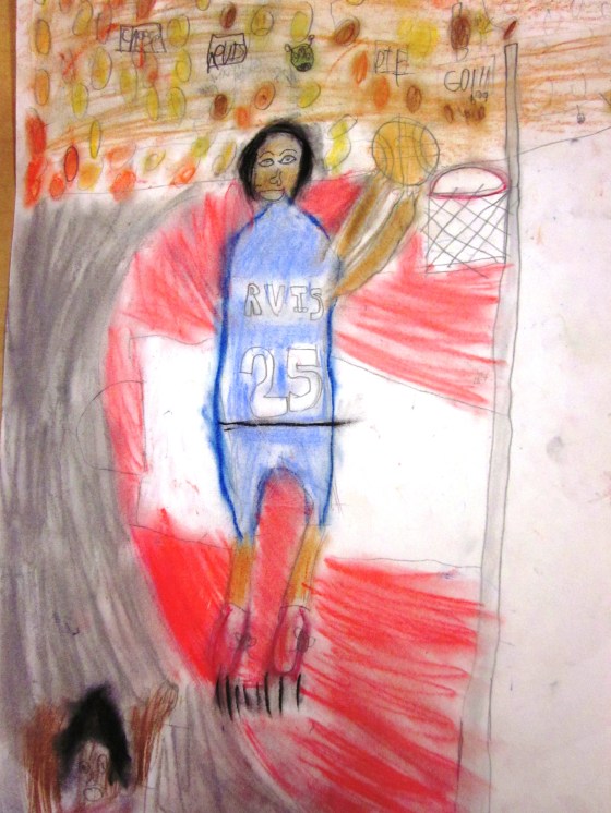 We looked at some of his paintings and discussed them for a while before brainstorming movements that each student could do that was ‘healthy‘ for the body–see the connection to the PE theme? 🙂 Karate, tennis, soccer, etc were the ideas and everyone was sent off to their seats with a 12×18 piece of paper, pencil and eraser.