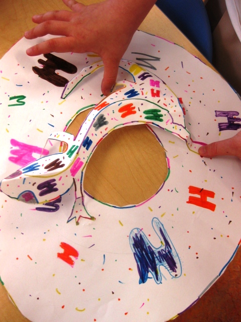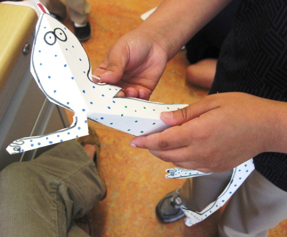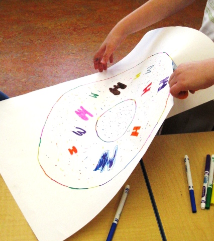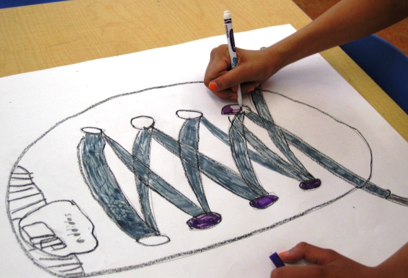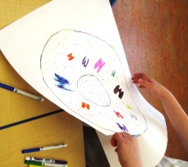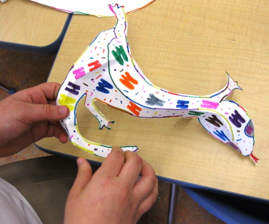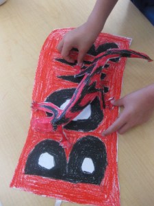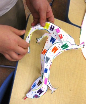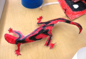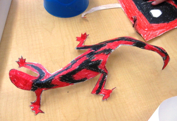 The final step was to draw the lizards on thicker paper such as bulletin board paper. Once the lizards were drawn, they had to be colored in to mimic part of the object they drew previously so their lizard would camouflage. The lizards were cut out, bent along the middle and the feet folded so they would ‘stand’ on their object after being glued.