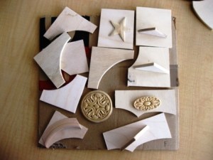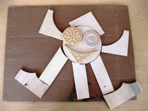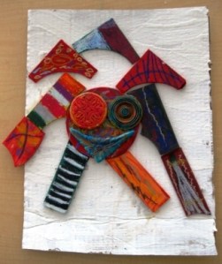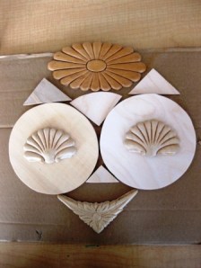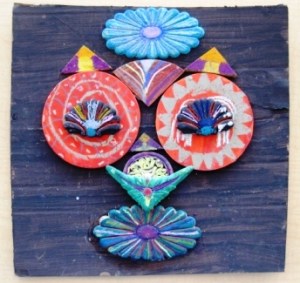 They painted a piece of cardboard in either white or black to serve as the background for their shape collage and the students painted all of their wooden pieces with a solid color. When these were dry, they added designs and details with oil pastels– 2-3 colors per shape.