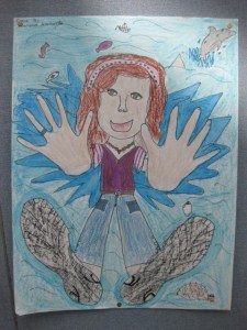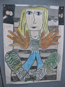 These ones were done by my grade six boys. I wanted to review lines with them so they divided their mosque into sections and filled them up with interesting lines and dots. The mosques were cut out and pasted onto a watercolor sunset background the boys made.