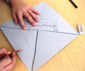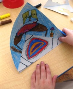 Next step was to think of a place where a lizard would not normally be found — after all this is an art class and the sky is the limit when it comes to imagination! This is a great time to introduce abstract art and look at some great works of Salvador Dali to get the kids inspired. Umbrellas, i pods, boots, etc were all drawn on large 18×12 paper and colored in.