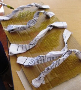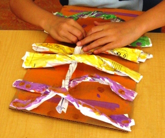 3. Have the students glue down the ends of their twisted paper onto the cardboard. These should be glued in a VERTICAL manner as they will be the warp. Use white glue and have the students count to 20 on each end to make sure it sticks down.