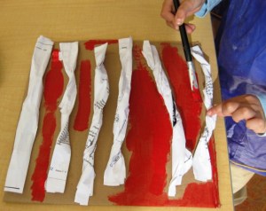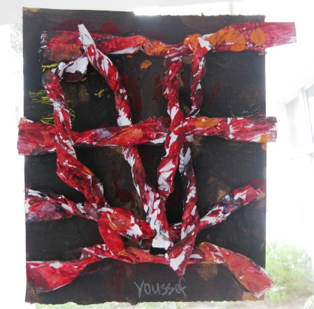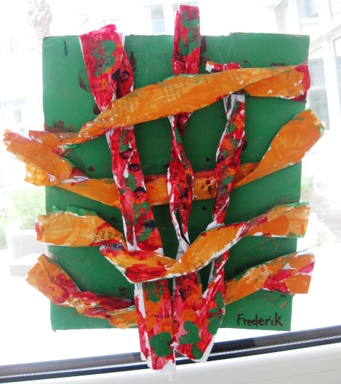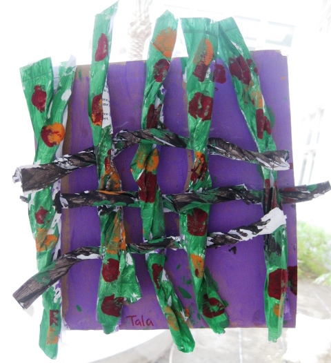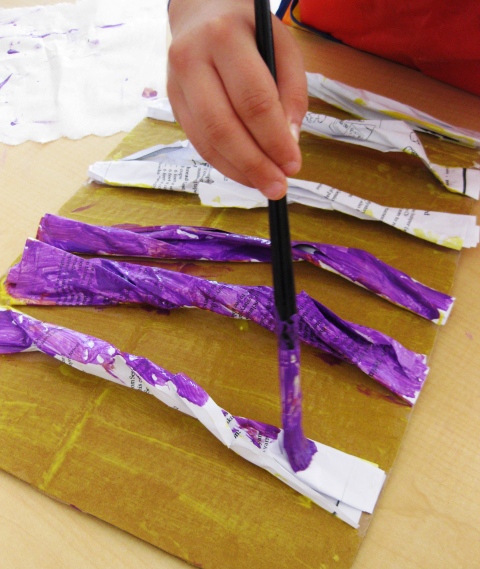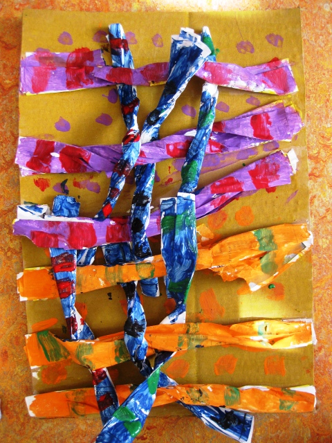 Next lesson, give out the rest of the log pieces and explain they need to go under, over and weave their paper. Some logs will come loose and this is ok. Have the kids finish weaving and then glue the end back down. Give out some more paint and let the kids finish their creations. Try this lesson with Grade ones and even grade three. They could even weave in other recycled material such as thick yarn, corrugated pieces of paper, etc.