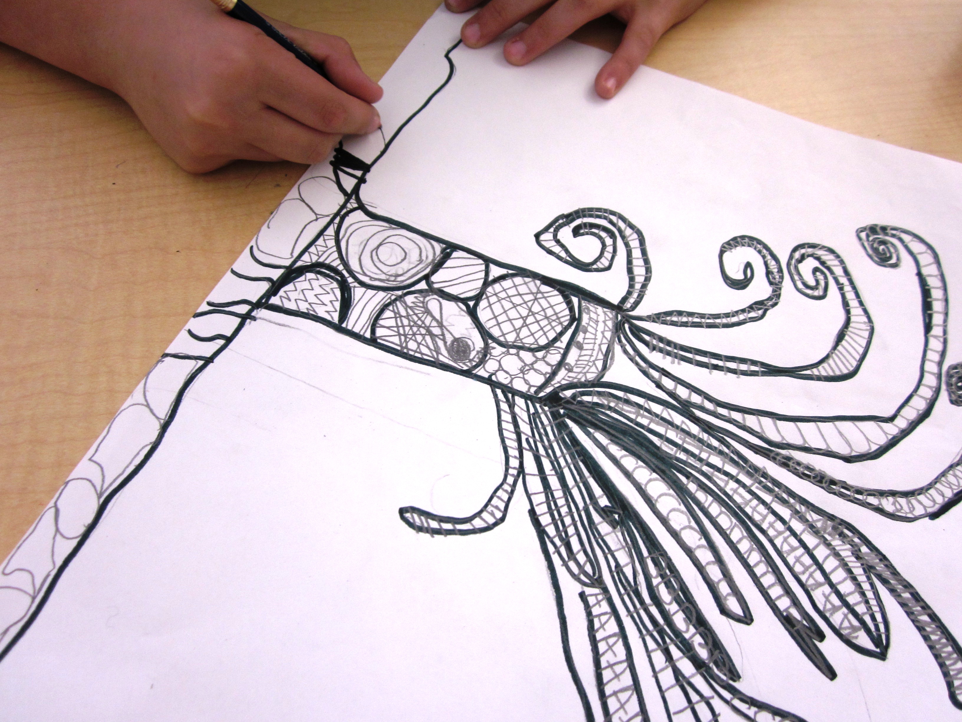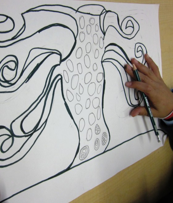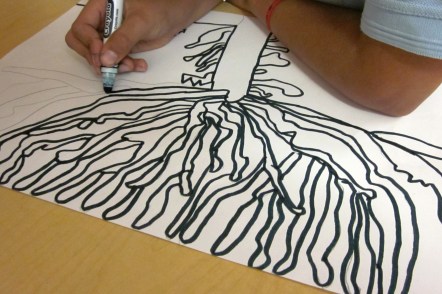 Next, the students divided sections in the tree trunk and filled each section with different lines and patterns with a dark pencil. These were not outlined with a black marker. Thick branches were also filled with pencil lines and patterns.