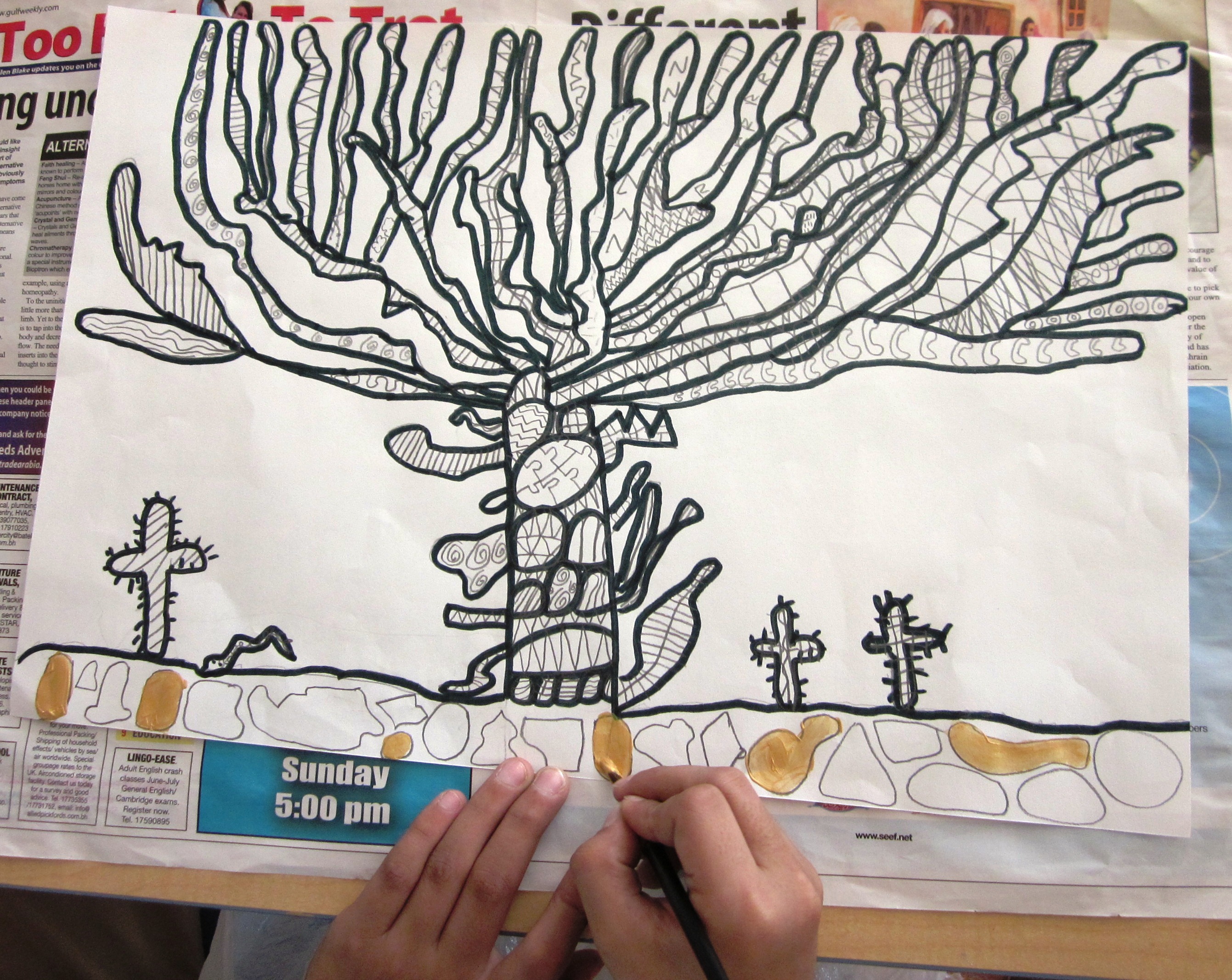 Bahrain is where I call home right now and it is also home to an apparently 400 years old tree named the Tree of Life. What makes this tree so special is that it not only lives in the middle of the desert, it also still remains a mystery where the tree gets it’s water source. Since all of my students have visited the tree at some point, it was the perfect subject matter to draw and paint a la Klimt mode!