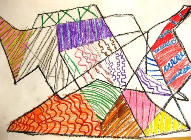 Next, tell your kids to color in some spaces with crayons and to fill in the areas with different lines they can think of such as dots, crosses, hatched lines, etc.