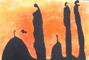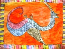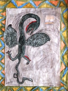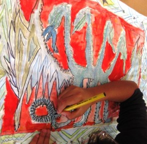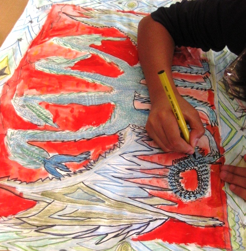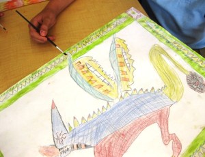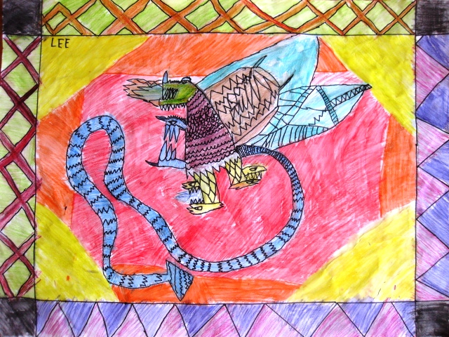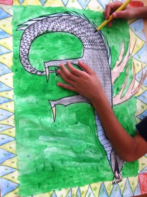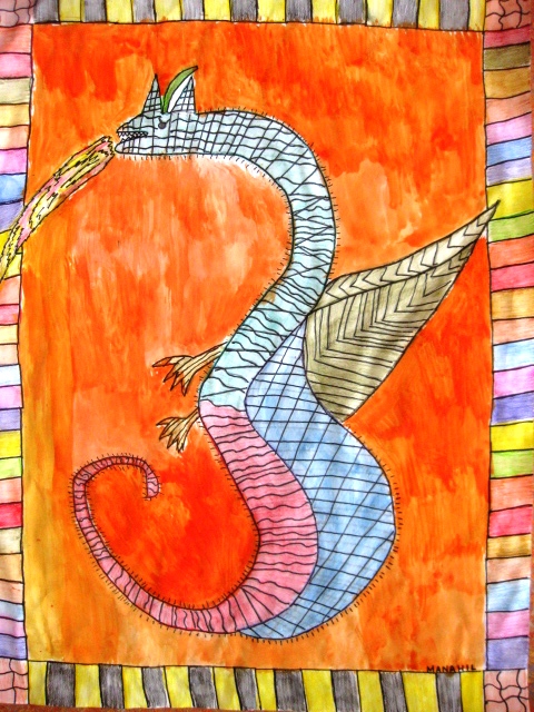 When the students added water to their sections colored in with watercolor pencils they thought it was neat that it turned into waterpaint. The main background behind the dragon was painted with regular watercolors.