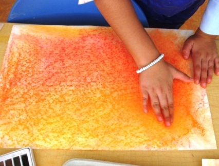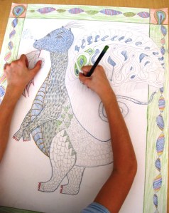 I gave out watercolor pencils and the borders and dragon were colored in.